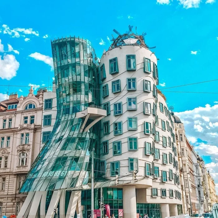 «Танцующий дом» (чеш. Tančící dům) стал одним из самых необычных зданий Праги. Он был спроектирован в 1992 году хорватско-чешским архитектором Владо Милуничем в сотрудничестве с канадским деконструктивистом Фрэнком Гери.