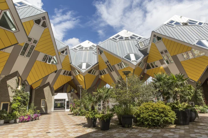 Эти инновационные сооружения в Роттердаме, Нидерланды, были спроектированы архитектором Питом Бломом. Каждый из уникальных домов представляет собой дерево, а все вместе они должны изображать лес. Каждый куб — жилой дом с тремя этажами, стены и окна которого расположены под необычными углами для классической архитектуры. Блом стремился создать «город в городе», где каждый куб символизирует абстрактное дерево, а весь комплекс — урбанистическую рощу.