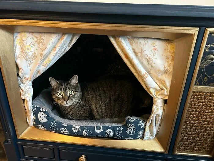 Старый бабушкин телевизор получает новую жизнь как стильный домик для кошки