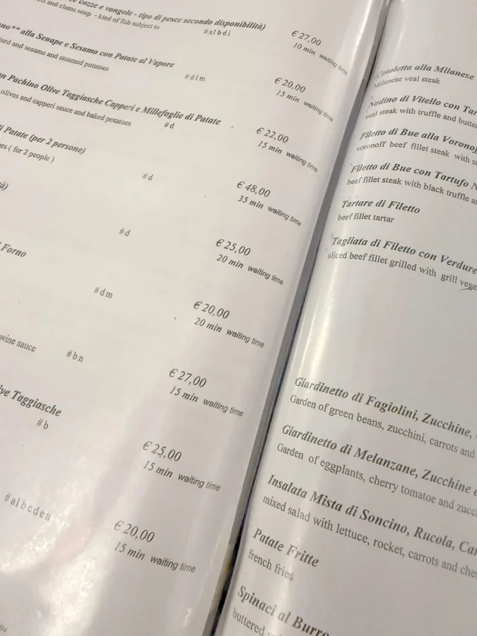 Конкретно в городе Рапалло. В меню указано время ожидания каждого блюда.