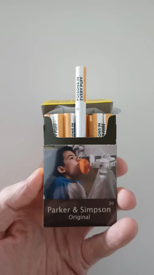 Предупреждение о вреде сигарет там прописывают на каждой отдельной сигарете. Конкретно здесь: «яд в каждой затяжке».