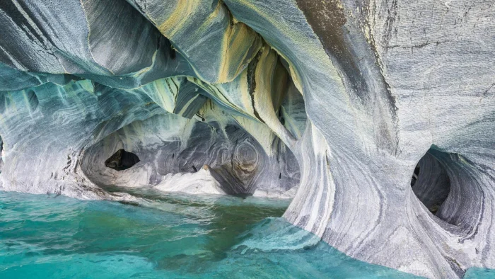 Мраморные пещеры (Cuevas de Mármol) спрятаны в Патагонских Андах на берегу озера Хенераль-Каррера. Их стены, отполированные водой, переливаются всеми оттенками лазури, от нежно-голубого до глубокого сапфирового. Интенсивность цвета меняется в зависимости от сезона и уровня воды.