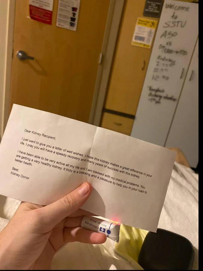 «Дорогой реципиент почки, я просто хочу пожелать вам всего наилучшего. Я надеюсь, что эта почка изменит вашу жизнь к лучшему. Молюсь о вашем скорейшем выздоровлении и долгих годах с новой почкой. Я всегда вёл активный образ жизни, и мне повезло, что у меня нет проблем со здоровьем. Ваша почка в отличном состоянии, и я рад, что могу помочь вам на пути к здоровью».