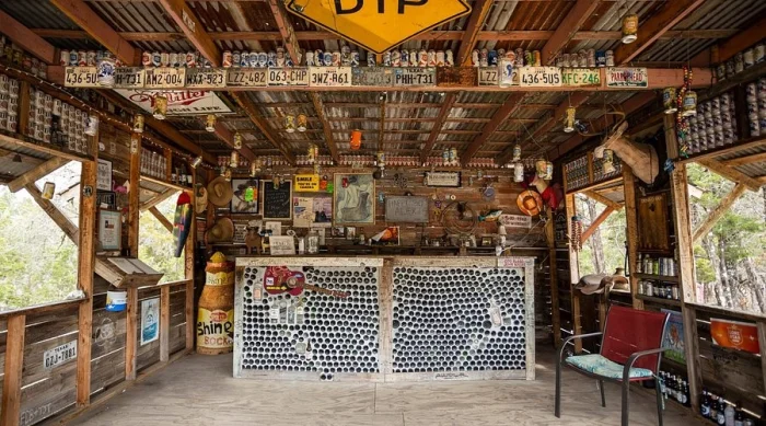 Этот салун на самом деле мини-музей с карикатурами, пивными банками и ёлкой из бутылок.