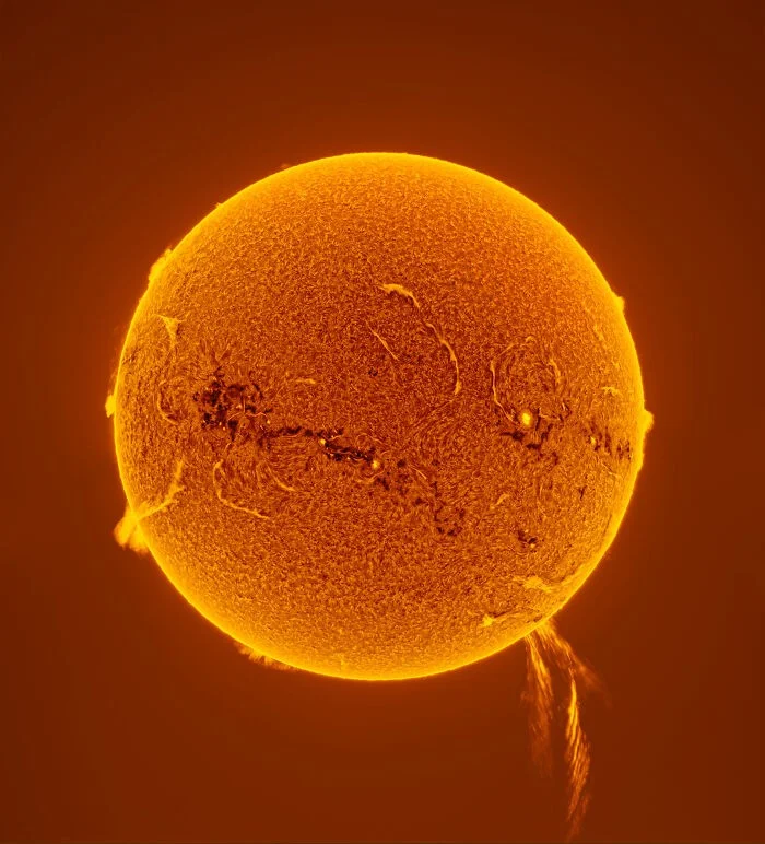 На фотографии — МКС, движущаяся по солнечному диску. Снимок Солнца был сделан отдельно с использованием двухслойного эталона — оптического фильтра, который выделяет определенные длины волн, позволяя детально наблюдать хромосферу.