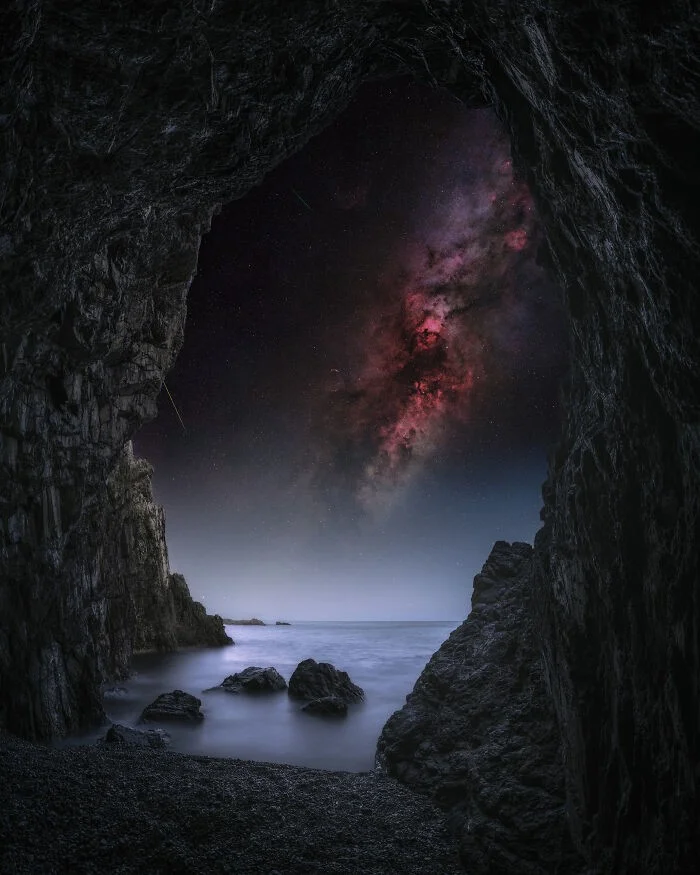Йошики Абэ понял, что из этой пещеры можно сделать потрясающий снимок Млечного пути. Он дождался идеального времени для съёмки. Это составная фотография: оба кадра были сделаны в одну ночь и в одном месте. Первый снимок — передний план — запечатлел «голубой час». Затем Абэ сдвинул штатив и сфотографировал звёздное небо.