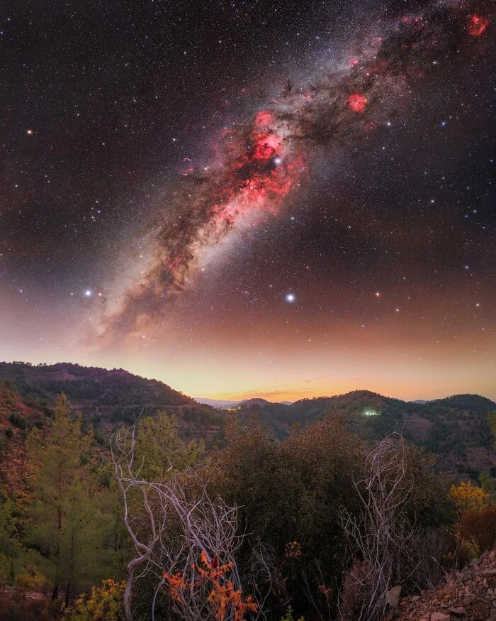 Панорама созвездия Лебедя в «Млечном пути», съёмка велась в Геракиесе, Кипр. Передний план снят во время «голубого часа». Это позволило детально запечатлеть горы и деревья, расположенные прямо перед камерой.