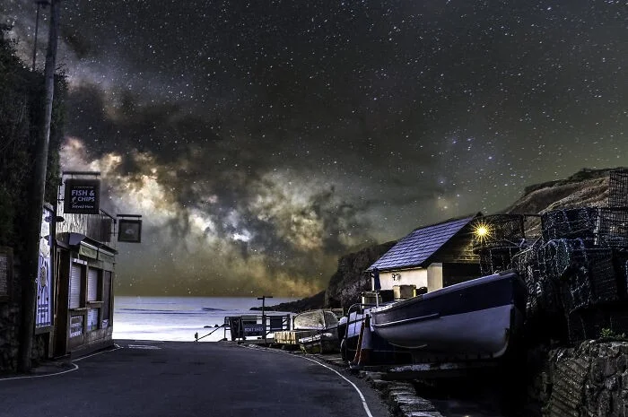 Млечный путь изгибается над бухтой Лалворт. Здесь, всего в нескольких минутах от воды, находится рыбный магазин с жареной картошкой, эллинг и маленькая лодка, дремлющая под покровом ночи.
