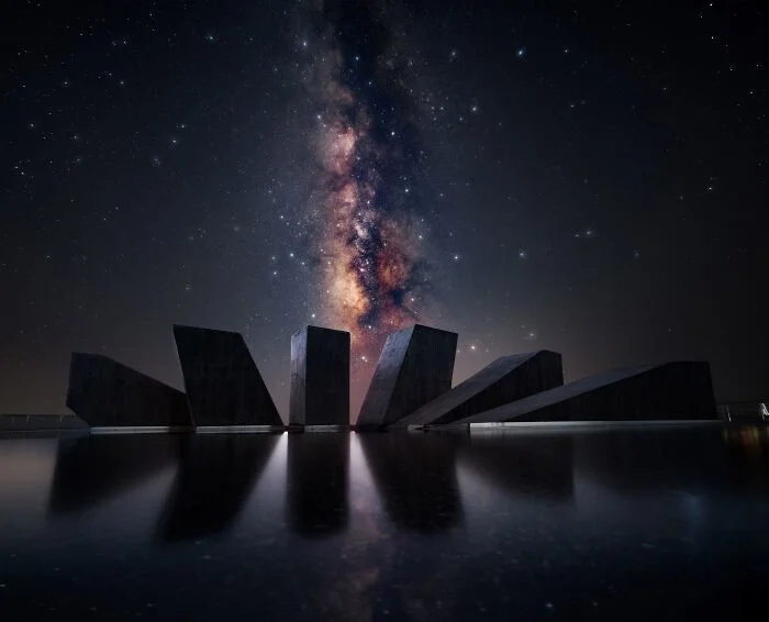 На фоне ночного неба над водой возвышаются чёрные геометрические здания, похожие на врата в галактику. За ними тянется яркий Млечный путь с мерцающими звёздами. Отражения строений дрожат в воде, размывая грань между реальностью и иллюзией, словно приглашая в тайны Вселенной.