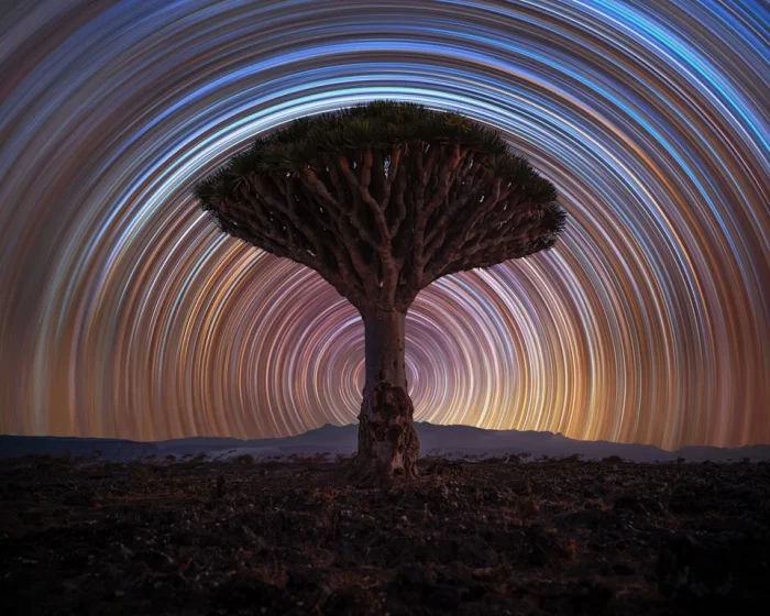 В сердце леса на острове Сокотра возвышается одинокое драконово дерево. Этот пейзаж уникален и не похож ни на что другое на Земле. Для создания итогового изображения было сделано 300 снимков.