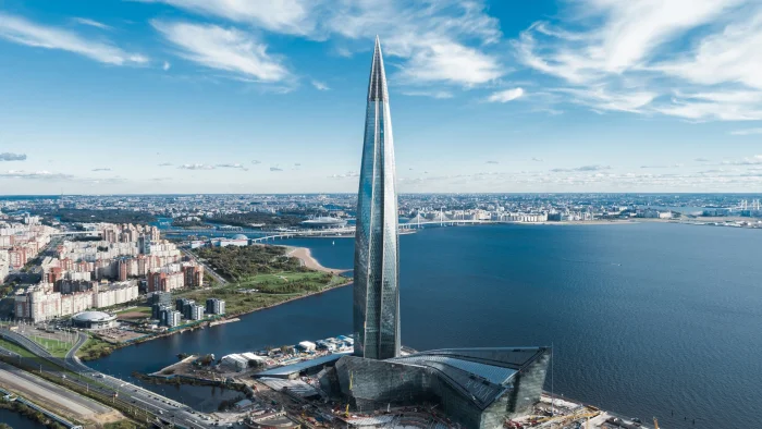 462-метровый "Лахта-центр" – самый высокий небоскрёб Европы – является настоящим шедевром современной архитектуры. Внутри расположены амфитеатр на 2000 мест, смотровая площадка на 357 метров и аквапарк, что делает его не только впечатляющим, но и функциональным сооружением.