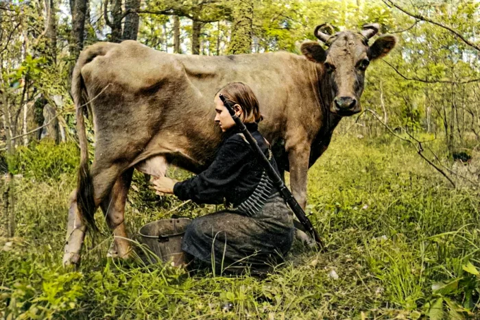 Партизанка доит корову во время Великой Отечественной войны, 1943 год.