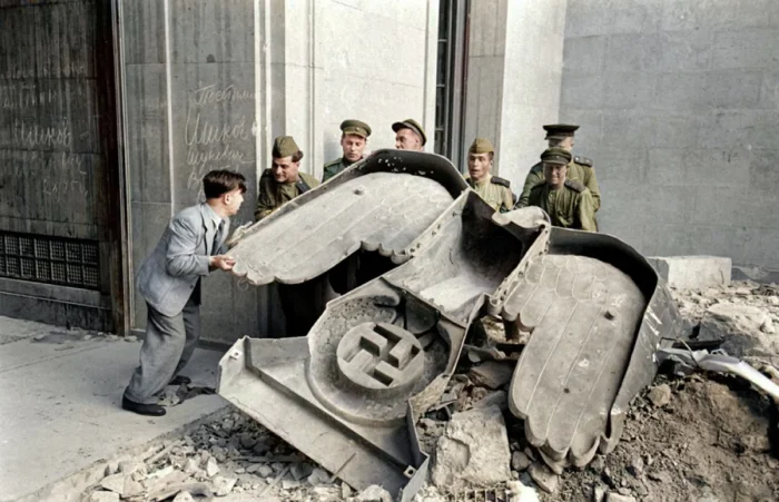 Советские солдаты забирают бронзового нацистского орла с фронтона Рейхсканцелярии. Им помогает немецкий студент (крайний слева). Берлин,1945 год.