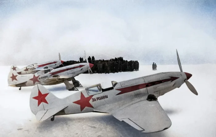 Советские ВВС, истребители МиГ-3 (И-18) в зимнем камуфляже во время обороны Москвы, 1942 год.