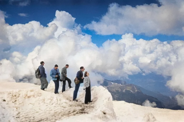 Джордж и Хильда Маллхолланд, чей медовый месяц в Швейцарии стоил 35 фунтов стерлингов, стоят на вершине Юнгфрау, любуясь видом, 1948 год.