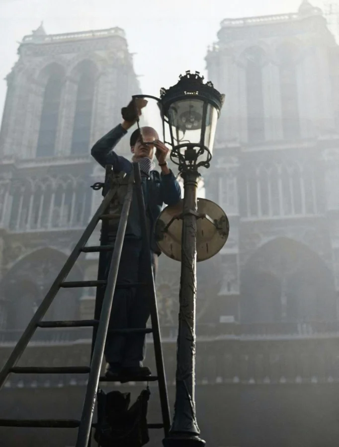 Мужчина меняет лампочку в одном из уличных фонарей Парижа перед собором Парижской Богоматери, 1960-е.