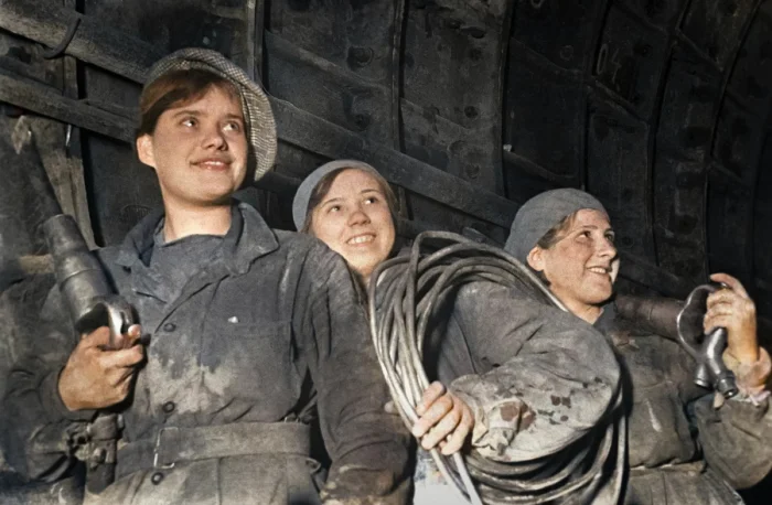 В 1930-х годах, когда Москва только начинала строить подземную сеть, наравне с мужчинами в тяжелом деле участвовали и женщины. Они работали бетонщицами, монтажницами, землекопами - в условиях шума, пыли и невероятной физической нагрузки.