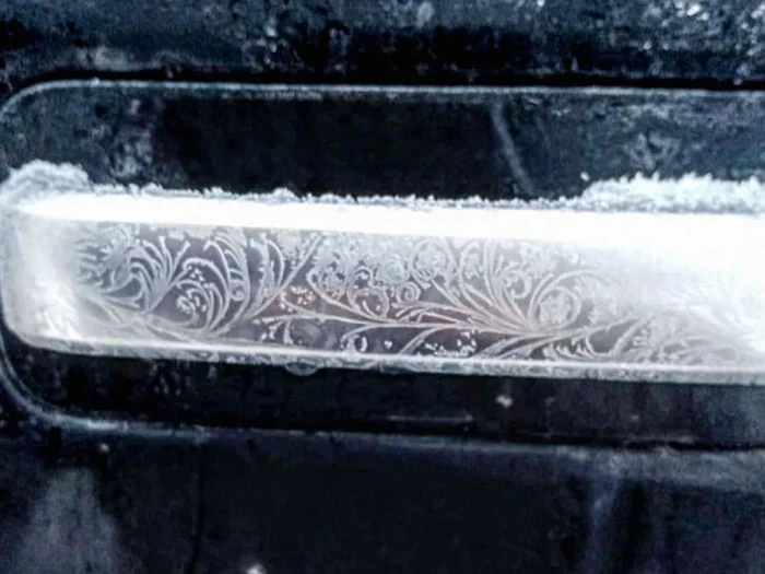 Этот удивительный макроснимок запечатлел природный шедевр — узоры инея на обычной дверной ручке грузовика в морозное утро, демонстрирующий красоту в мелочах.