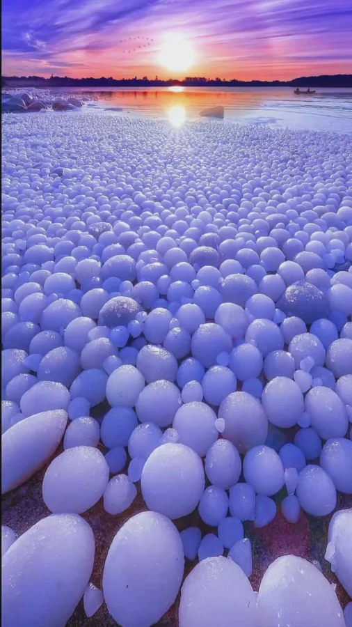 Потрясающее фото демонстрирует редкое природное явление — идеально круглые ледяные шары, выброшенные на берег в Северной Финляндии, напоминающие гигантские жемчужины или яйца мифических существ, созданные совместной работой ветра, воды и экстремального холода.