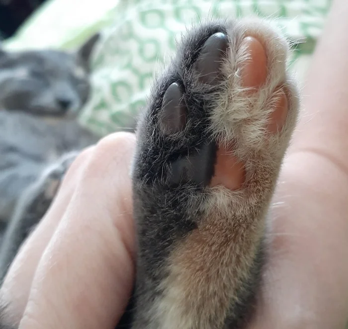 Милый снимок демонстрирует редкое явление — лапку котёнка с идеально разделённым окрасом, как будто невидимый художник провёл кистью, создав контраст между розовыми и тёмными подушечками.