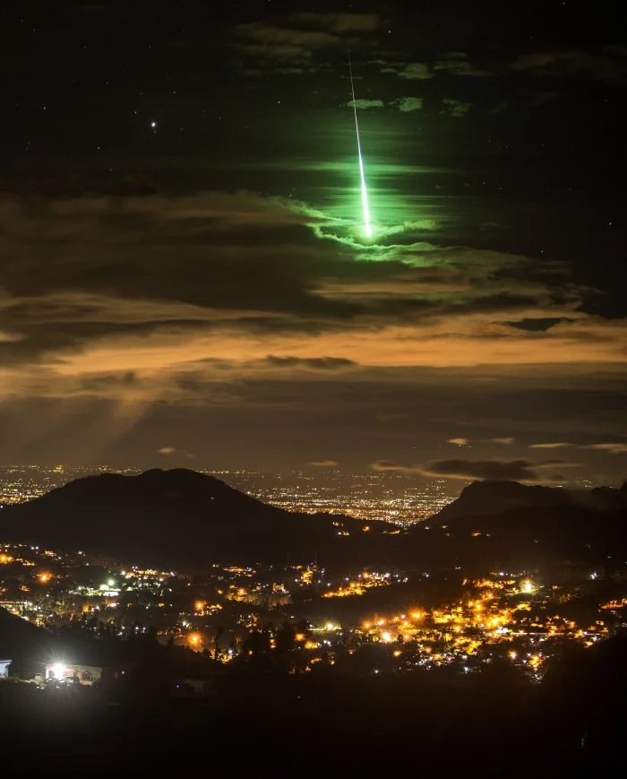 Невероятный кадр — редкое астрономическое явление — ярко-зелёный метеор, вспыхнувший в ночном небе над Индией, оставляющий за собой след из удивления и трепета.