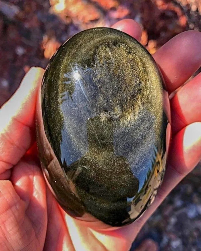 Завораживающий момент демонстрирует редкую разновидность вулканического стекла — золотистый обсидиан из Мексики, камень словно содержит в своих глубинах жидкое солнце, переливающееся при малейшем повороте, открывая свою уникальную красоту.