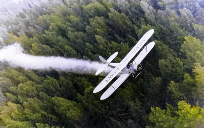 Биплан Поликарпова По-2 (У-2) распыляет пестициды над лесами, конец 1940-х годов.