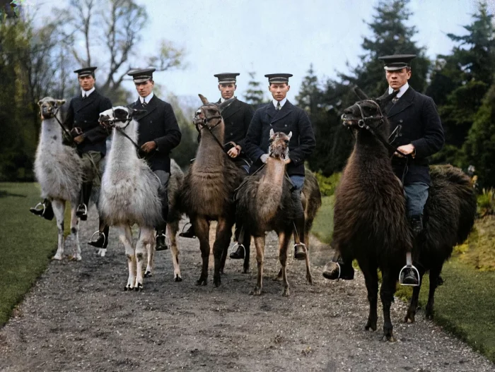 Смотрители верхом на ламах в частной собственности мистера Уингфилдса. Англия, 1911 год.