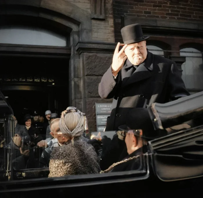 Уинстон Черчилль с сигарой во рту и поднятыми двумя пальцами в знаке «V» — один из самых узнаваемых символов Великобритании времён Второй мировой войны. Этот жест, означавший «Победа» (Victory), стал не только личным почерком премьер-министра, но и мощным символом стойкости, надежды и сопротивления фашизму.