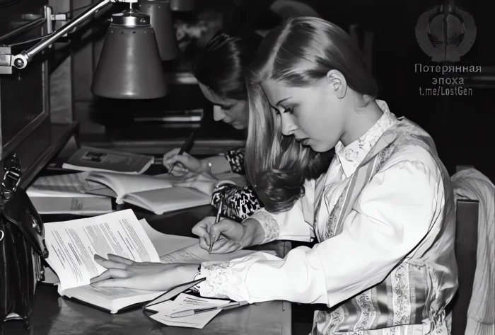 В 1998 году студентки в читальном зале Российской государственной библиотеки в Москве были запечатлены в процессе изучения и обучения.