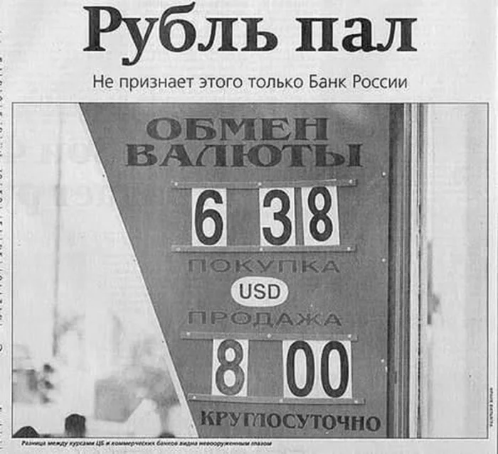 Вырезка из газеты показывает разницу между курсами ЦБ и коммерческими банками, отражая экономическую ситуацию.