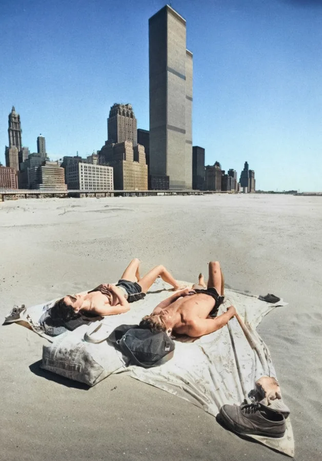 Пляж на фоне Всемирного торгового центра. Нью-Йорк, 1977 год.