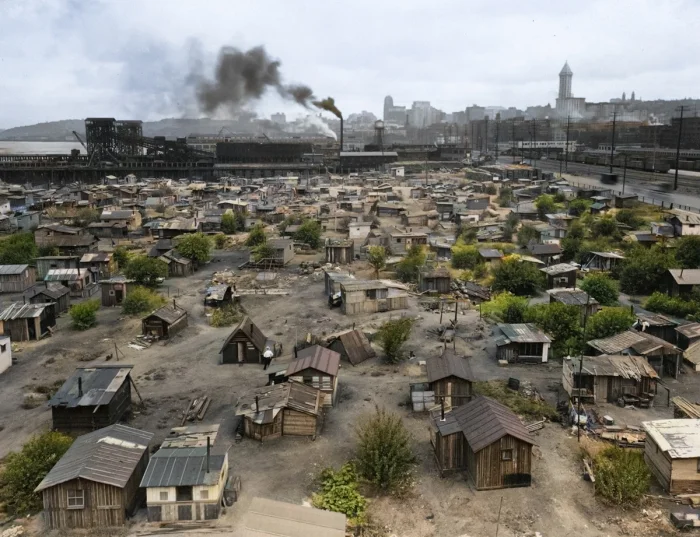 «Гувервиль» стал общим термином для обозначения трущоб и лагерей для бездомных во время Великой депрессии. В штате Вашингтон их было десятки, по всей стране — сотни. «Гувервиль» был намеренно политизированным ярлыком, подчеркивающим, что президент Герберт Гувер и Республиканская партия должны были нести ответственность за экономический кризис и его невзгоды. Главный Гувервиль Сиэтла был одним из крупнейших, самых долгоживущих и лучше всего задокументированных в стране. Он простоял десять лет, с 1931 по 1941 год. Занимая девять акров общественной земли, он вмещал до 1200 человек, заявлял о своем собственном местном самоуправлении, включая неофициального мэра, и пользовался защитой левых групп и сочувствующих государственных чиновников, пока земля не понадобилась для судоходных сооружений накануне Второй мировой войны.
