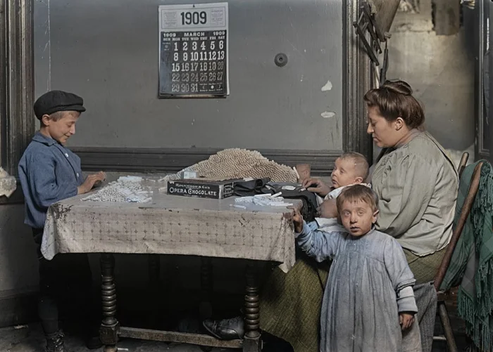 Мама с детьми крутит самокрутки в многоквартирном доме в Нью-Йорке, 1909 год.