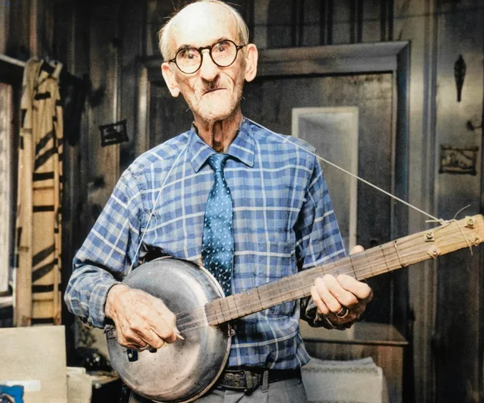 90–летний мистер Фрэнк Фосс из Санкт–Петербурга, штат Флорида США, со своим банджо, сделанным из сковородки и прочих подручных материалов, 1972 год.