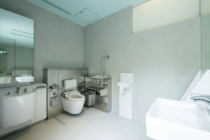 Туалет состоит из трёх отдельных помещений, оформленных по мотивам японского искусства «оригата», что создаёт ощущение завёрнутого подарка.
