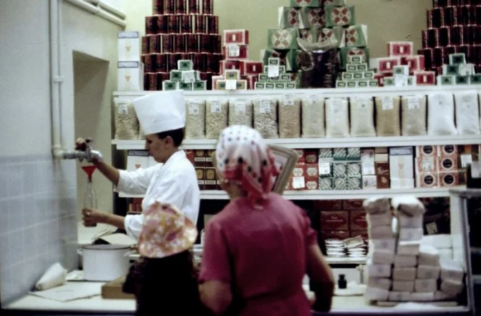 Продавщица в магазине наливает масло из маслопровода . Интересно.