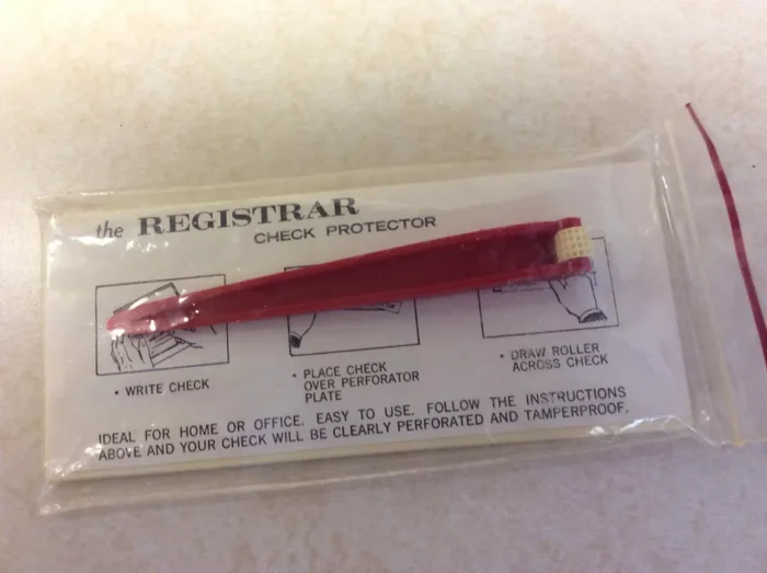 ...представляет собой устройство для защиты банковских чеков. Если написать на нем сумму, а потом провести валиком, то написанную сумму будет крайне сложно изменить на иную из-за того, что на бумаге выдавились бугорки.
