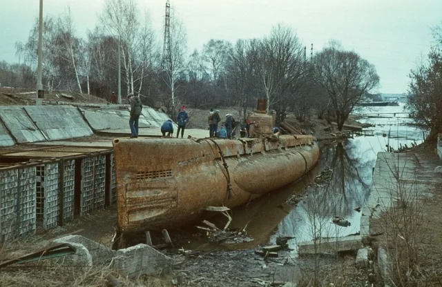 Небольшой залив Химкинского водохранилища около Ленинградского шоссе и брошенная подводная лодка, облюбованная детворой