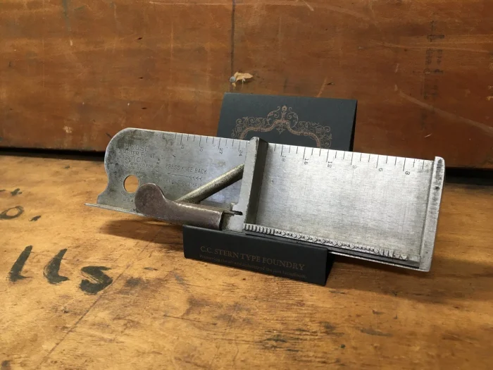 Этот металлический прибор с подвижной стенкой является наборной верстаткой, используемой типографскими наборщиками для набора шрифта. В нее вставляются металлические литеры.
