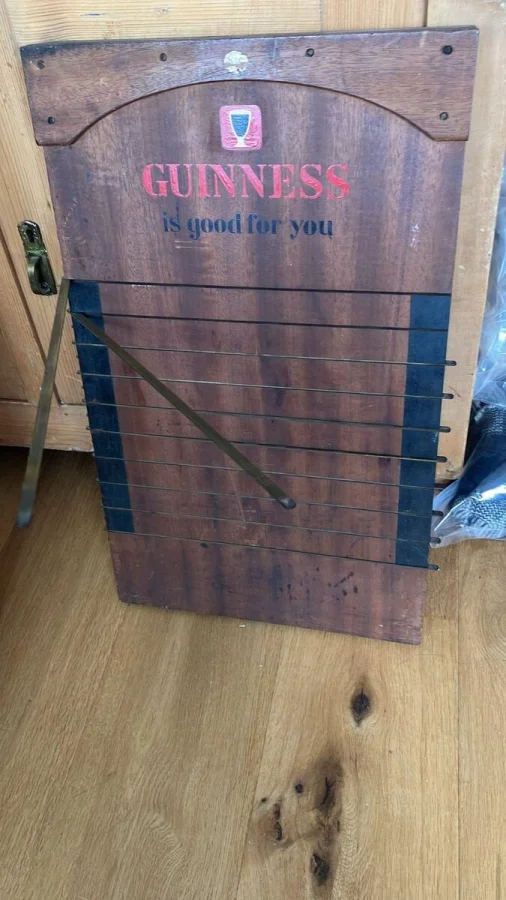 Эта доска с металлическими пластинами используется для игры в популярную английскую барную игру Shove ha'penny. Игроки по очереди толкают монеты по гладкой деревянной доске, стремясь остановить их между двумя горизонтальными линиями. Металлические пластины помогают четко разделить зоны и избежать спорных моментов.