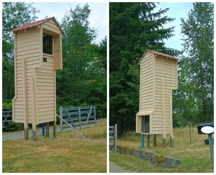 Это устройство представляет собой дорожный перископ, предназначенный для безопасного выезда из гаража или узкой дороги, когда обзор перекрыт препятствиями. Оно состоит из длинной вертикальной трубы с зеркалами, позволяя водителю видеть ситуацию на дороге без необходимости выходить из машины.