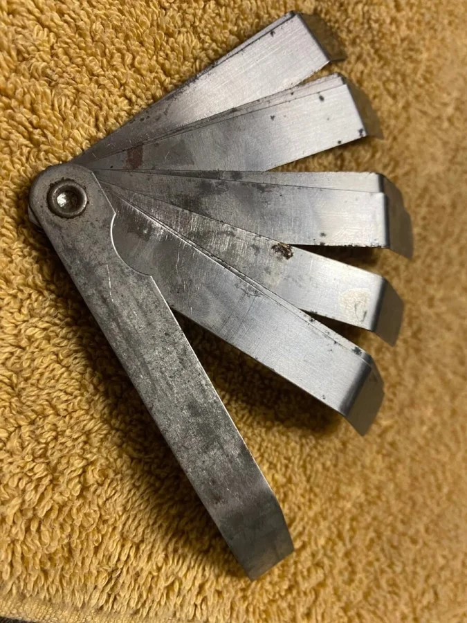 Этот набор металлических пластинок разной толщины представляет собой измерительный щуп, используемый для измерения зазоров между деталями.