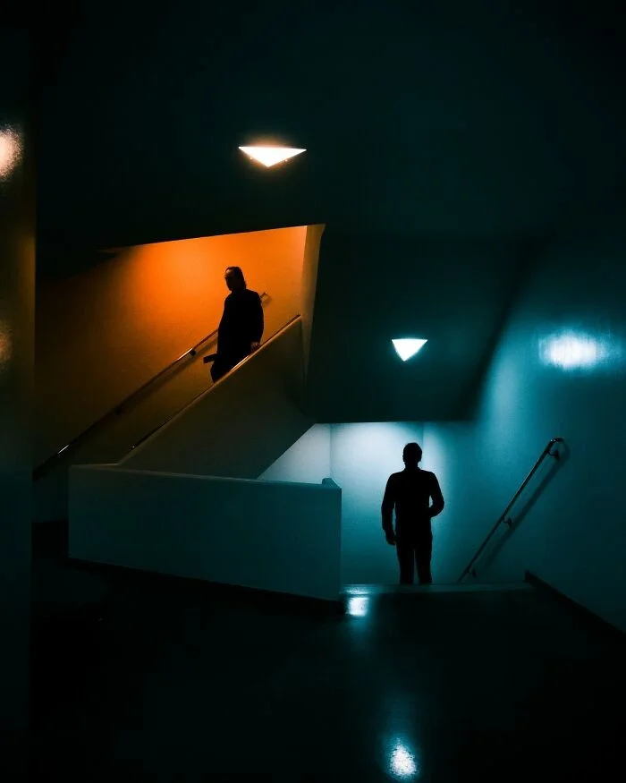 Шаги звучат глухо. Свет мигает. Две фигуры пересекаются в тишине. Они не потеряны, но словно зависли между реальностью и пустотой.