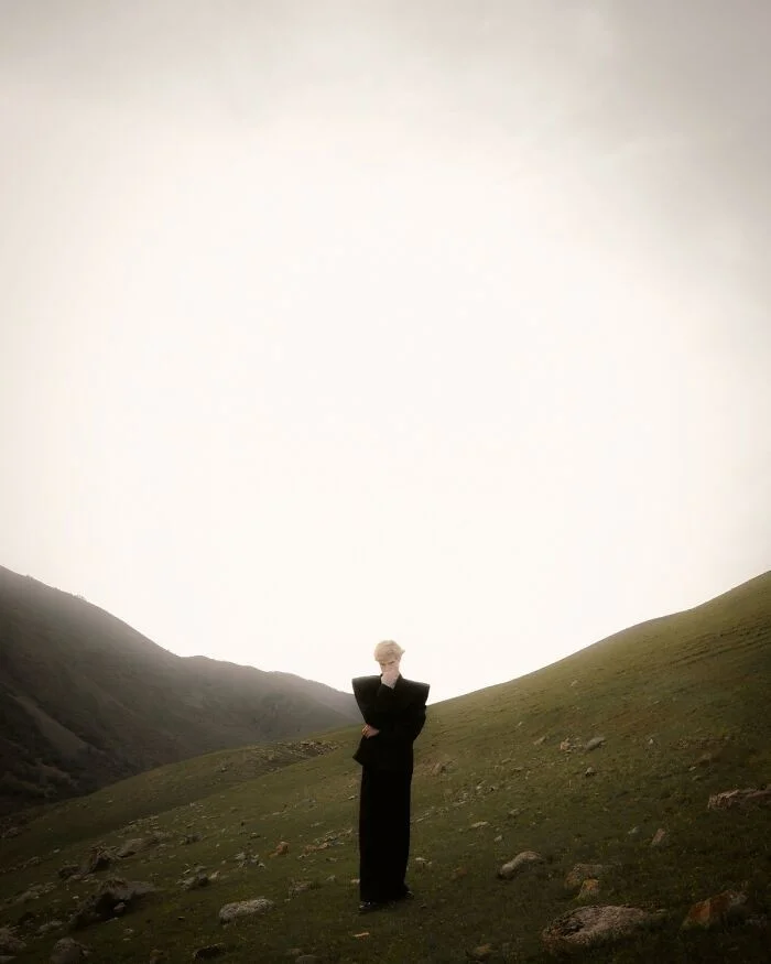 Костюм скроен так, чтобы придать фигуре скульптурность и добавить образу таинственности. Фон, залитый рассеянным светом, делает силуэт модели контрастным на фоне гор.