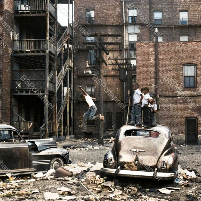 Дети на брошенных машинах в трущобах Чикаго, Иллинойс, США, 1954 год.