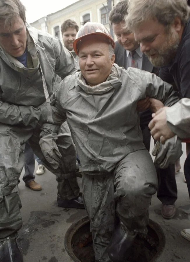 Мэр Москвы Юрий Лужков перед путешествием под московскими мостовыми, 1994 год.