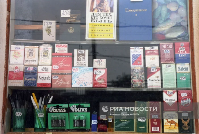 Витрина коммерческого табачного киоска на Комсомольском проспекте в Москве, 1993 год.