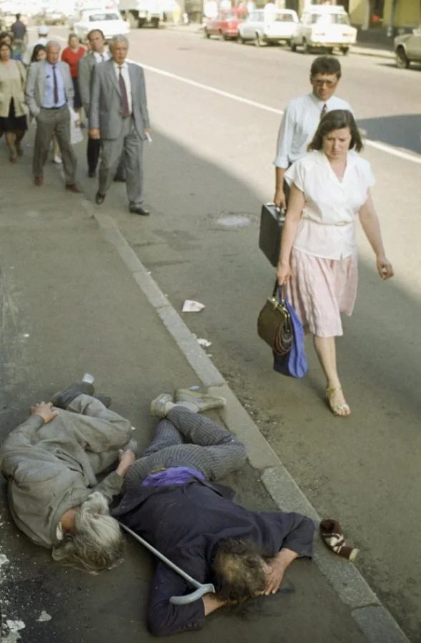 Бездомные люди спят на тротуаре на одной из улиц в центре Москвы. Июль 1993 года.