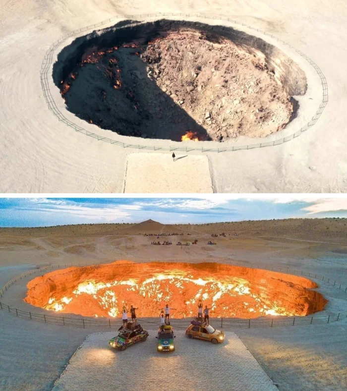 Газовый кратер Дарваза, постоянно горящий с 1971 года, часто называют «Вратами в ад». Его глубина достигает 20 метров, а диаметр — 60 метров.